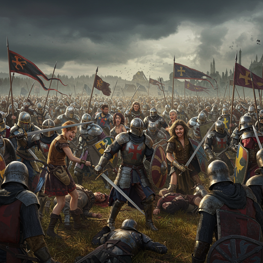 A fantasy medieval battlefield unfolds under a brooding sky, teeming with hundreds of warriors clad in intricate armor, their swords and shields glinting with a mystical glow. The digital masterpiece captures the essence of epic warfare with hyperrealistic detail, rendered in 8k using Cinema 4D and Blender's octane engines. The scene, inspired by the whimsical yet dramatic styles of Studio Ghibli and artists like Jeremy Mann and Greg Manchess, features vivid, atmospheric colors that weave together a cinematic and sensual narrative. Despite the chaos, there's a touch of humor and surrealism in the characters' expressions, offering an unconventional charm. The warriors, captured in a modelshoot style, display a variety of realistic, sharply focused features, with vibrant costumes and mythical elements. This high-concept art, trending on ArtStation and CGSociety, marries the fantastical with the photorealistic, resulting in a striking visual piece that is majestic, intricate, and dynamic.