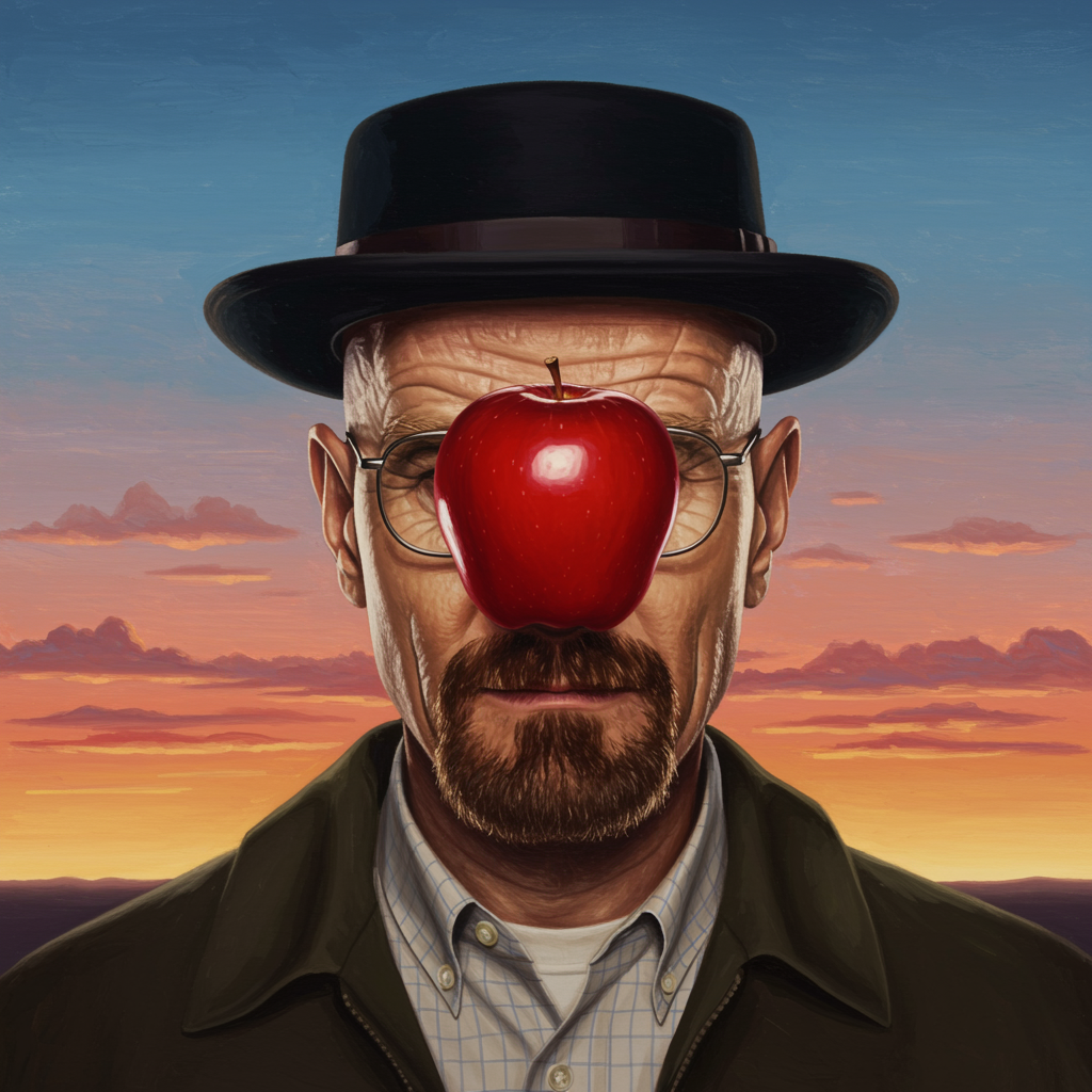 A hyper realistic portrait of Bryan Cranston as Heisenberg from Breaking Bad, standing directly in front of the viewer. A bright red apple floats mysteriously in front of his face, slightly obscuring his intense gaze. Behind him, a backdrop of vibrant sunrise with pink and orange hues replaces the typical blue sky and clouds, adding a surreal twist. The style captures the essence of René Magritte's "The Son of Man," with an oil painting technique that emphasizes texture and depth, while subtle shadows cast by the apple and his iconic black hat add a sense of intrigue and mystery to the composition.