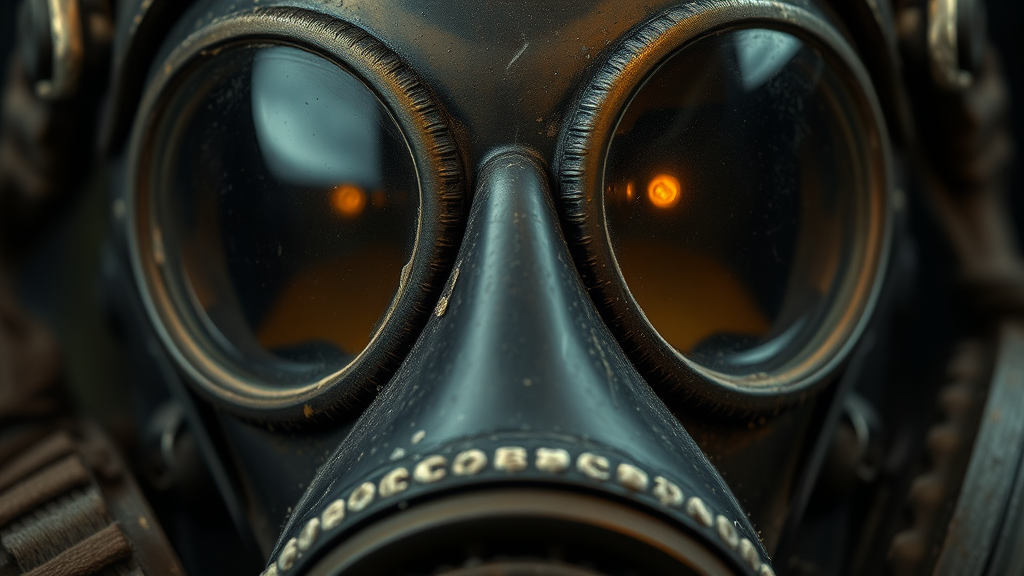 A close-up shot of a Chernobyl liquidator's gas mask fills the frame with gritty, realistic detail. The mask is visibly worn and authentic, drawing inspiration from Soviet-era designs with rounded, slightly fogged lenses, thick rubber seals showing signs of wear, and robust straps. Fine cracks run along its surface, hinting at intense use in a radioactive environment. Ash and grime from the reactor's fallout are caked onto the exterior, with small flecks caught in the crevices. A faint, ominous glow reflects off the lenses, suggesting the eerie presence of lingering radiation.