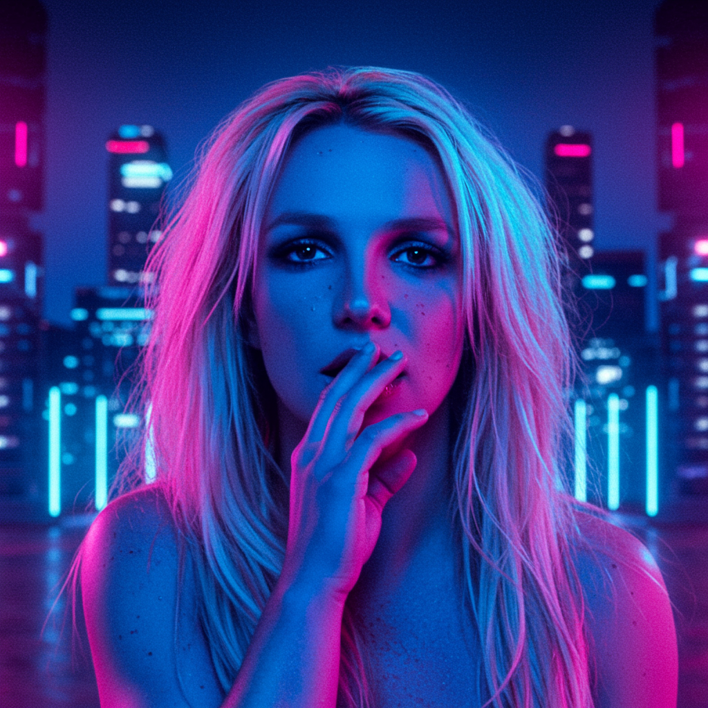Britney Spears electric twilight whispers, a realm where shadows dance under neon lights, pulsating with the rhythm of midnight city dreams.