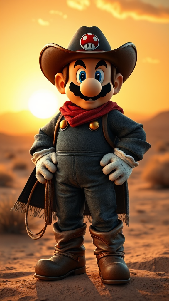 Super Mario embodies a rugged cowboy from Red Dead Redemption, wearing a detailed poncho draped over a black duster coat, complete with a wide-brimmed cowboy hat adorned with a mushroom emblem. His signature overalls are replaced by worn leather chaps and sturdy cowboy boots that echo the dusty trails of the Wild West. A lasso hangs at his side, and his confident stance suggests a seasoned gunslinger. The scene captures a dynamic motion picture shot, with Mario standing in a windswept desert landscape, the sun setting behind him, casting an epic silhouette reminiscent of western legends.