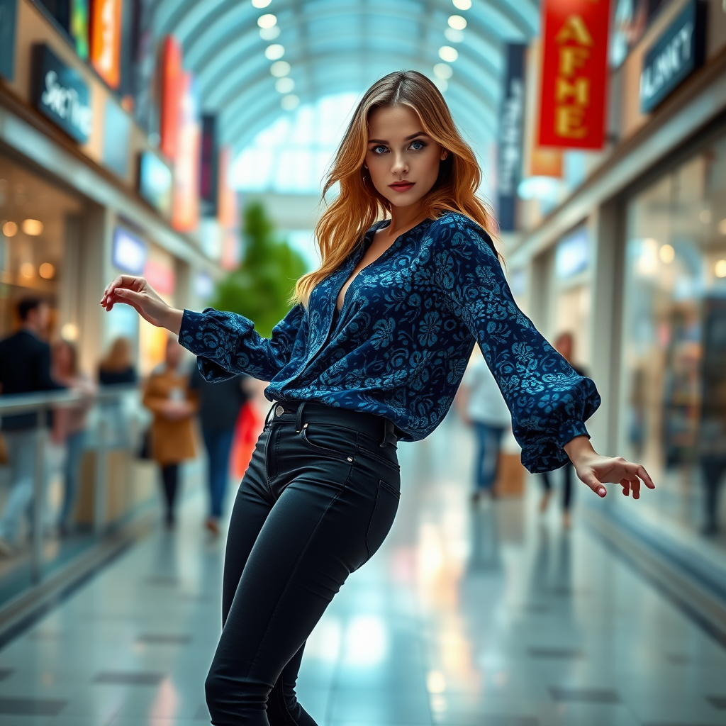 A stunning full-body portrait of a captivating model with striking blue eyes, gracefully dancing in a stylish blue batik casual blouse paired with sleek black jeans. The fashion shot exudes an editorial flair, rich in detail and showcasing a masterpiece of photographic artistry. The high-contrast imagery highlights the model’s elegance against the vibrant ambiance of a bustling indoor shopping mall. Subtle creative elements add a unique touch to the scene, enhancing the overall visual impact while maintaining the core concept.