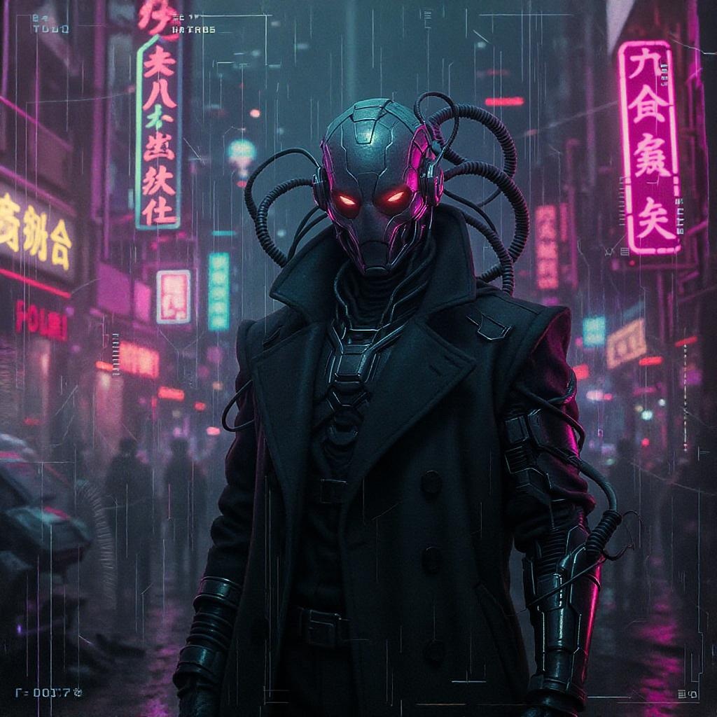 A Technomancer clad in a sleek black trench coat stands confidently, their visage enhanced with intricate cybernetic headgear. Cable wires coil around their arms like serpentine armor, emphasizing their detailed, symmetrical features. The futuristic backdrop of 2077 is alive with vibrant neon lights, painting a vivid cyberpunk and biopunk world. Despite the low resolution, the environment crackles with energy. While artifacts and text errors might obscure some details, the Technomancer's presence is undeniable. Imperfections like occasional missing digits or poorly drawn features blend into the chaotic, dystopian landscape, adding to its eerie charm. Cropped scenes and fuzzy outlines create an almost surreal experience, as if peering into a fragmented reality where beauty intertwines with grotesque distortion. Watermarks and other visual quirks contribute to the atmosphere, making the scene feel like an uncanny digital relic from a future both mesmerizing and unsettling.