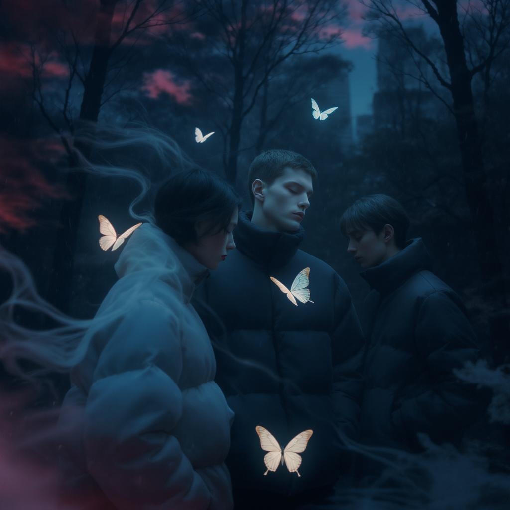 A dreamy, soft-focus image of winter fashion featuring androgynous figures in sleek puffer jackets, characterized by minimalist aesthetics, set against a surreal night sky where shades of red and blue dominate in a dance of change and wind. Realistic butterflies provide a gentle glow as they flit through a shadowy forest, adding a magical touch. The scene, enveloped in a cool palette of light blacks and ethereal hues, captures a metropolitan energy with serene expressions, flowing forms, and abstract compositions.