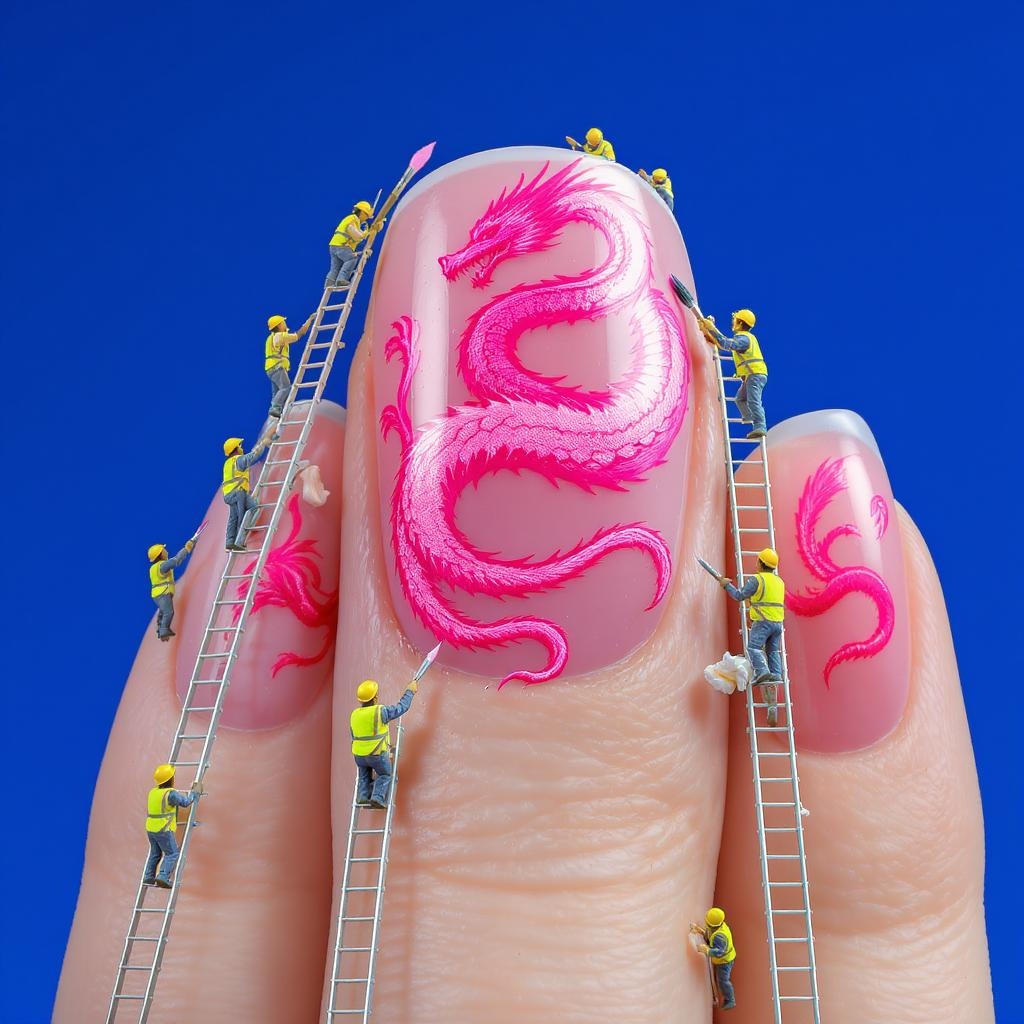 A team of tiny, miniature workers in bright uniforms is passionately painting and drawing an enchanting ombre pink dragon across the surface of gigantic fingernails. Some are wielding oversized paint brushes, while others are diligently polishing with soft cloths. They are strategically positioned atop ladders and petite platforms, working with the precision of artisans sculpting a colossal masterpiece. The bold, vibrant blue background complements the scene, creating a captivating contrast. The entire scenario is surreal yet captured with photorealistic detail, showcasing cinematic depth of field, ultra-fine textures, and a whimsical yet impeccably professional atmosphere.