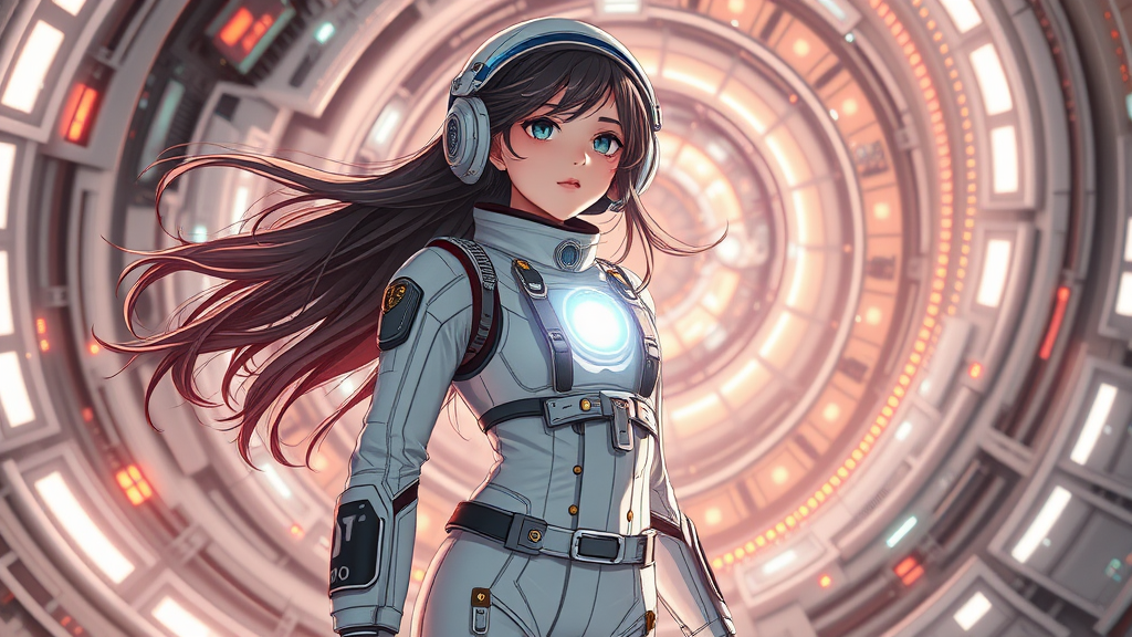 A captivating girl in a spacesuit set against the backdrop of a colossal, hyper-detailed, minimalist sci-fi spaceship, inspired by the styles of Tsutomu Nihei and Sidonia no Kishi. Her dynamically flowing hair catches cinematic lighting, casting striking highlights. The glow from her suit accentuates features like the helmet, piercings, and a bright luminescence on her chest. She embodies a slender frame with narrow hips and wears heels, while gold rivets and symmetrical design elements add to the aesthetic. The scene is infused with intense, blinding lights that emphasize her presence, surrounded by an atmosphere of clarity and precision. Her expression is animated, contrasting with the vastness of space, capturing both intrigue and the essence of futuristic elegance.