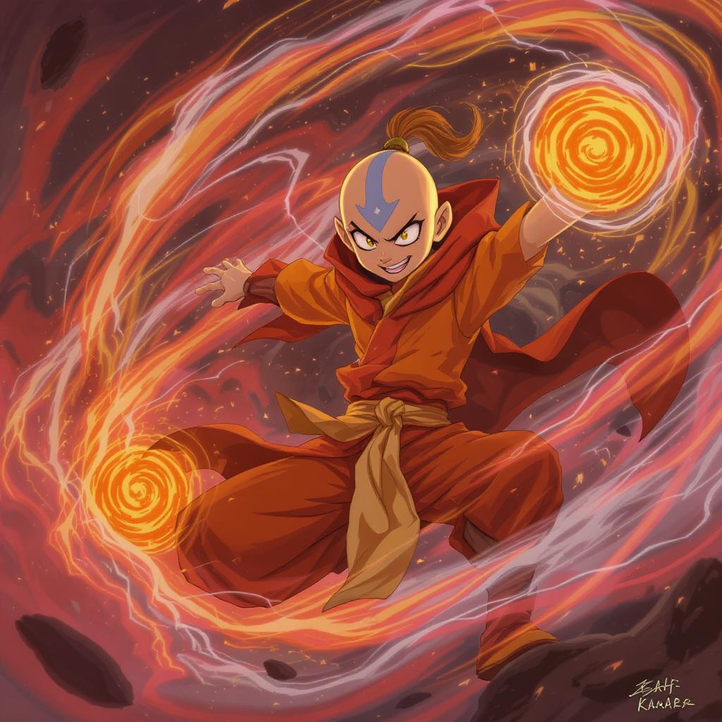 young avatar aang the last airbender furry style orange robes red atmosphere vibrant colors mystical elements playful expression surrounding him energetic pose dynamic environment mystical energy flowing around whimsical details creative interpretation fantasy landscape