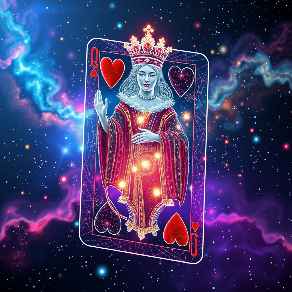 The Queen of Hearts card morphs into a vibrant 3D hologram composed of shimmering cosmic matter. As the regal figure emerges, stars and colorful galaxies dance around, evoking the sensation of voyaging through the cosmos. The Queen's attire is embellished with intricate celestial motifs, and a radiant cluster of stars serves as his crown. This holographic marvel floats before you, with the backdrop transitioning through a tapestry of cosmic wonders—from ethereal nebulae to swirling black holes. An ideal spectacle for space-themed gatherings, sci-fi conventions, or ultramodern tech showcases.