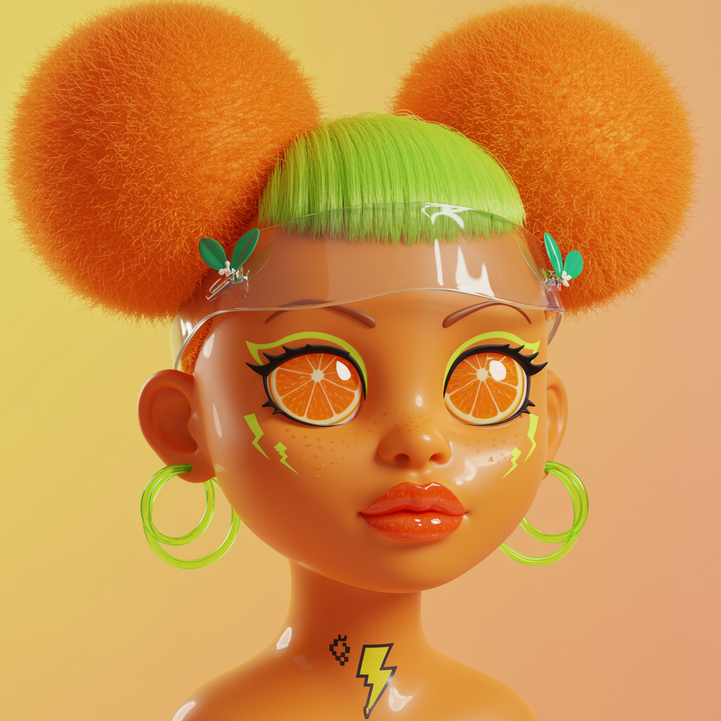 A vibrant, hyper-stylized 3D floating head of a tangy-punk vinyl doll radiates charisma and mischief. The face is crafted from glossy warm honey-tone vinyl, its temple and chin catching light with a striking mirror-like gleam. The eyes captivate with their fizzy-orange irises, each hosting playful citrus-slice pupils accentuated by sharp lime-green winged liner. Crowned with twin giant tangerine-fuzz puffs, the hair contrasts against a subtly visible chartreuse shaved undercut. Lips gleam with a juicy blood-orange lacquer, creating an ultra-wet reflective finish. Accessories include a sleek clear acrylic visor band adorned with chrome citrus-leaf clips, complemented by triple neon-green resin hoops dangling confidently. A pixel-art thunder tattoo sits boldly beneath the right eye. The backdrop transitions from mango-yellow to pastel-peach, set aglow by bright beauty lighting that throws crisp hotspots on the doll's glossy skin. The perspective is captured through an 85 mm portrait crop, showcasing the plush fuzz of the hair, the vinyl-shine of the skin, and the glistening surfaces of glass-like lips and resin hoops. This acid-fruit punk doll bursts with stylistic flair, embodying an eccentric charm.