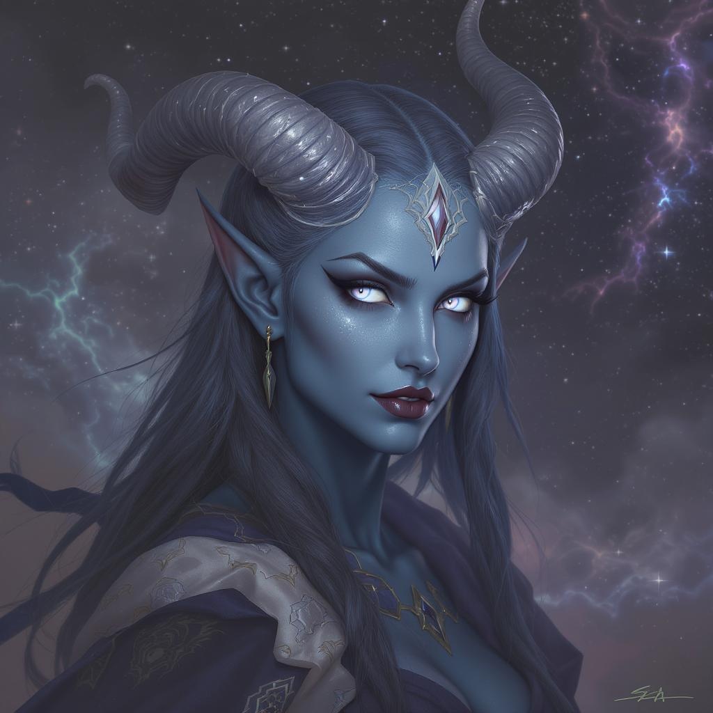 A captivating portrait of a blue-skinned tiefling woman with elegantly curved horns, her demon-like visage exuding an enigmatic allure. Her cosmic aura shimmers with iridescent hues reminiscent of distant galaxies, enhancing her celestial presence. Her striking features blend the mystique of an ancient oni and the beauty of a celestial being, with large, expressive eyes that glow with an inner fire. Her intricate horns, lush and ornate, gracefully crown her head, adding a regal elegance to her demeanor. Framed by cascading dark hair that accentuates the ethereal glow of her skin, she embodies a unique fusion of fantasy and anime aesthetics. Her expression is one of quiet confidence and wisdom, reminiscent of a character brought to life in the style of Arcane, capturing the essence of the d&d world she belongs to.
