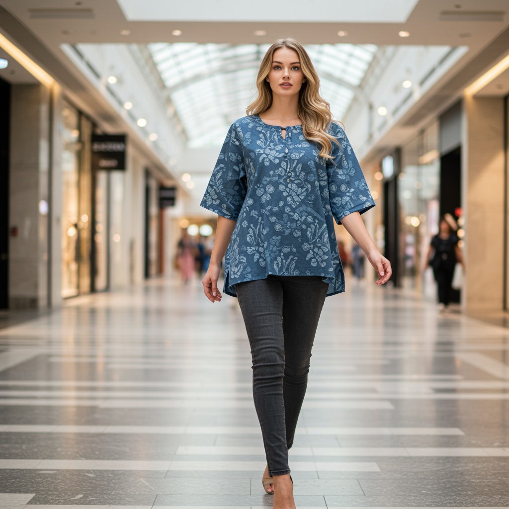 Full body shot portrait of an elegant model with striking blue eyes, gracefully moving in a slate-blue batik casual blouse paired with fitted charcoal jeans, capturing a sense of fashion and dynamic energy, designed for an editorial feel, with intricate detail and bold contrast, set against the lively backdrop of a modern indoor shopping mall.