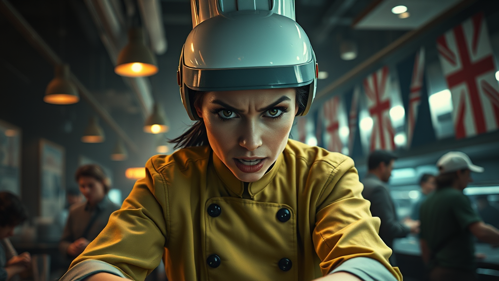 An aggressive female chef in a bustling restaurant, wearing an intricately detailed formal uniform in chartreuse and earthy green tones, inspired by a futuristic sci-fi dieselpunk aesthetic. The scene is captured with dramatic cinematic lighting from a low angle, emphasizing her dynamic action posture as she passionately works. Her expression is fierce and intense, with wide-open eyes and a raised eyebrow, conveying frustration over mundane tasks. The fabric of her uniform is rendered with realistic details and folds. The setting is dark yet vivid, contrasting with a simple, monochromatic backdrop that features minimalistic hints of flags and stars. She wears a futuristic helmet with a hard surface, adding to the scene’s edgy vibe. The focus is on capturing her as a masterpiece with the highest facial details, amid an environment of frenzied creativity and dull chaos.