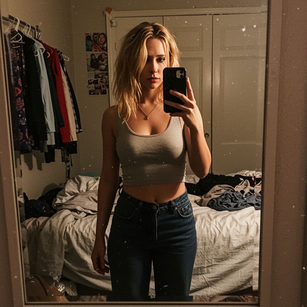 A woman reminiscent of Jennifer Love Hewitt stands before a mirror, attempting a selfie with a vintage vibe. The photo has a grainy texture, with a soft blur that mutes the exactness of her image. Dim lighting spills into the room, casting deep shadows that partially obscure her face. The space is chaotic, with an assortment of clothes scattered over the bed and a disheveled blanket hanging halfway to the floor. Her expression is one of focused nonchalance as she holds up an old smartphone that struggles to capture the scene, lending an authentic, unrefined feel to the snapshot. The mirror bears the marks of everyday life, with visible smudges and fingerprints, further enhancing the raw, lived-in atmosphere of the moment.