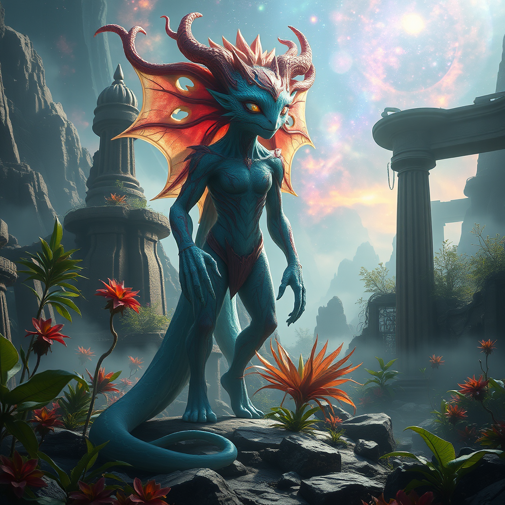 Full body portrait of an enchanting fantasy creature, exuding an ethereal glow, captured in stunning professional photography, showcasing a true masterpiece quality reminiscent of unreal engine visuals, with incredibly high detail. Set on a breathtaking fantasy planet, evoking a sense of wonder and dreamlike ambiance, inspired by the styles of Jean Ansell, Justin Gerard, and Greg Rutkowski. The scene is alive with dynamic lighting that enhances the vibrant plants and diverse fauna amidst lush flora. Framed within a cinematic setting, the creature stands amidst awe-inspiring, ancient ruins, enveloped by colorful nebulas and a mystical mist, creating a surreal and fantastical atmosphere.