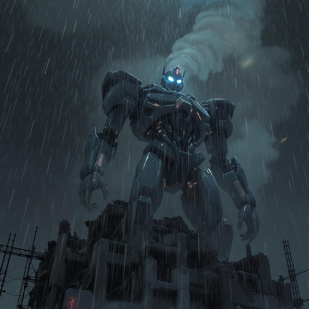 A colossal robot poised atop the ruins of a building, its luminous eyes piercing through the gloom, reminiscent of Bionicle design, blending mecha and cyberpunk aesthetics with a detailed mask. The night is drenched in rain, mingling with rising smoke, captured in an intricately detailed 8k render. The scene exudes a CG cinematic feel, perfect for a wallpaper, highlighting breathtaking quality with a finely detailed depth of field. Elements of cartoon and anime sketches subtly influence the silhouette, enhancing its dynamic presence amid a dystopian backdrop.