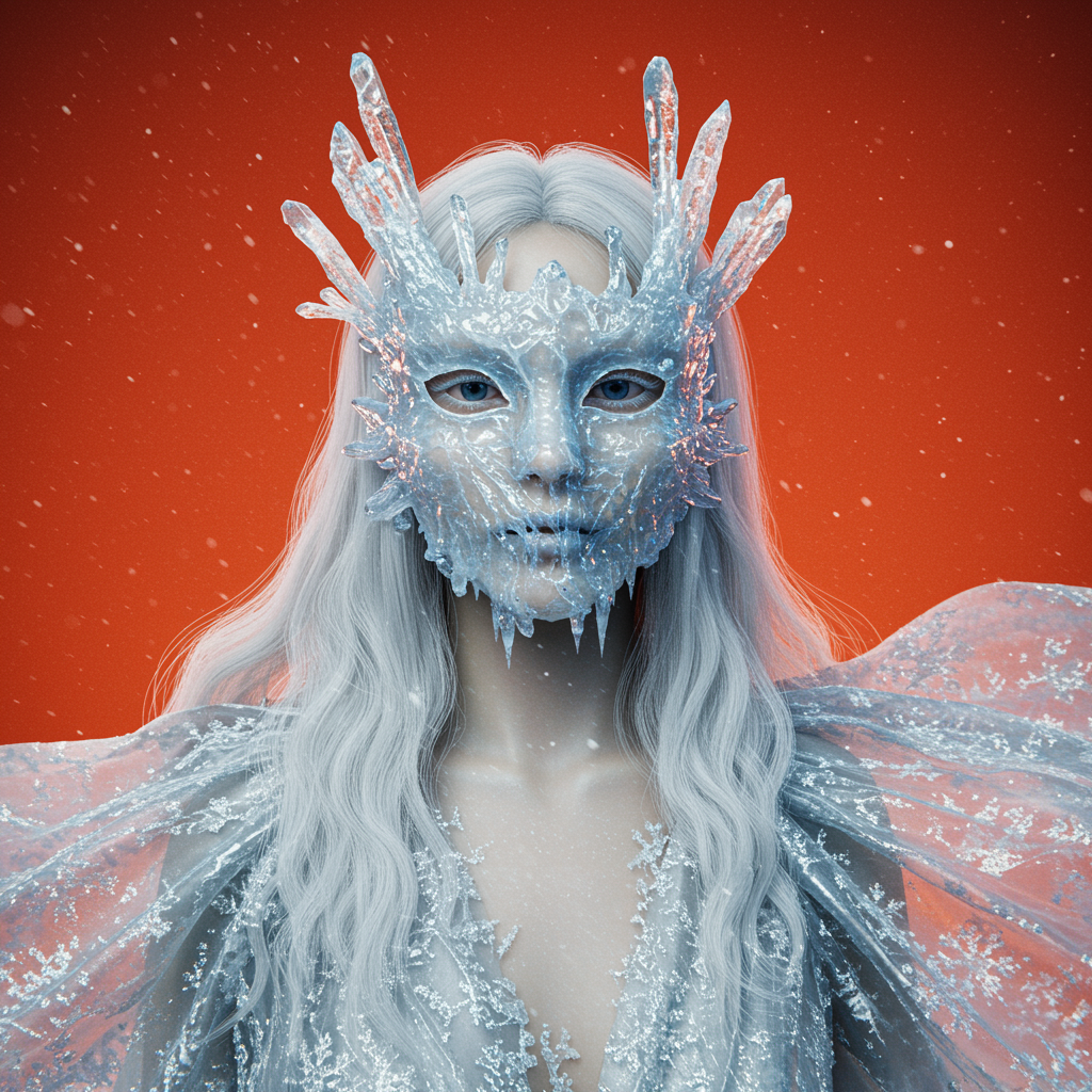A hyper-realistic portrait in HD, 8K, depicting a woman wearing a shimmering ice mask that covers her face entirely. The mask is smooth and semi-transparent, adorned with intricate crystal formations that asymmetrically branch along its edges, resembling the delicate fractal patterns of frozen water. She is dressed in a flowing gown of lustrous silver and white silk, intricately embroidered with delicate snowflake designs, its fabric glittering as if touched by frost. The gown billows as though caught in an eternal, gentle winter breeze, conveying an ethereal sense of motion. Her hair, cascading in silky white waves, glimmers softly, enhancing her pale, porcelain-like complexion that radiates a subtle, frost-touched glow. The background is a vivid orange-red, creating a captivating contrast to the icy elements of her attire, resulting in a striking visual balance that highlights her frozen elegance. Soft, cool lighting emphasizes the translucent intricacies of her mask and the icy shimmer of her gown, surrounding her in an aura of otherworldly enchantment and pristine winter beauty.