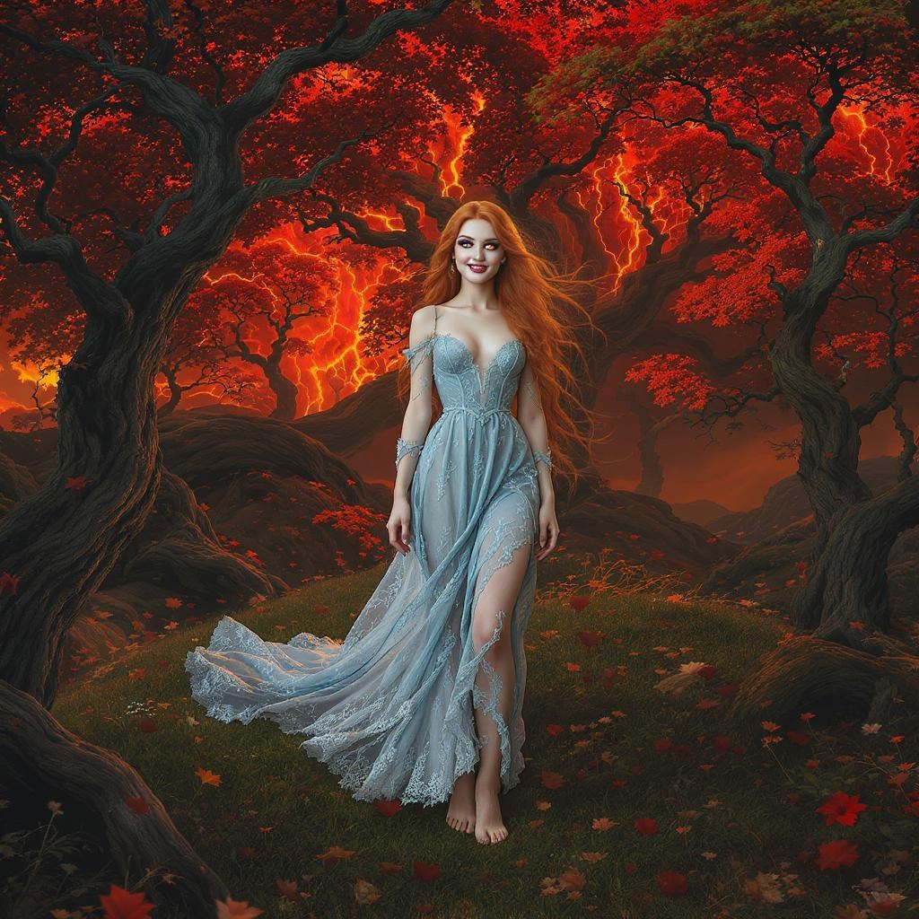 A fantastical landscape blending a mystical forest with elements of Dante's inferno, featuring a striking full-body portrait of an enchanting Nordic red-haired girl. She stands at the heart of a lush hill, smiling gracefully, her delicate feet peeking from beneath a flowing blue lace dress. Her captivating presence, with a perfectly detailed face and symmetrical hazel eyes with circular irises, is captured in a stunningly realistic photograph. The scene has a 3D render quality with intricately detailed, cinematic touches, evoking the styles of Mucha, Klimt, and Erté. This hyperrealistic portrait, reminiscent of a behance contest winner, presents a smooth, ultra-high-definition artwork with an epic and ominous atmosphere. Enhanced by the influences of artists like Artgerm, H.R. Giger, and Beksinski, this vibrant masterpiece is rendered in 8K using Unreal Engine 5, showcasing ultra-sharp focus and intricate detailing, creating an exquisite, enigmatic presence in the setting of a fantasy world.