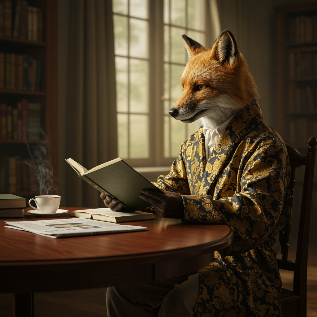 A sophisticated anthropomorphic fox elegantly seated at a polished wooden table immersed in a novel, adorned in an ornate robe, a crisp newspaper set aside. The scene captures a tranquil morning routine in an atmospheric dusty library, with warm sunlight filtering through tall windows. The fox's cinematic ensemble adds a touch of timeless elegance, while a steaming cup of coffee rests nearby, completing this serene and intellectual portrait.
