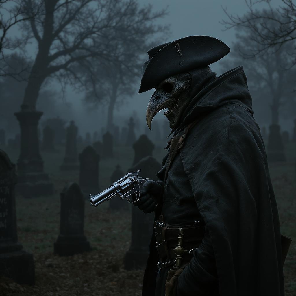 17th century plague doctor stands in a mist-laden graveyard, his silhouette defined by a wide-brimmed hat and the eerie beak of his mask. Clad in a worn leather cloak, his hand rests on a gleaming 6-shooter revolver, anachronistic yet fitting within this epic fantasy realm. Every detail is meticulously captured in 8k resolution, with cinematic lighting casting dramatic shadows that dance among the tombstones. The scene boasts sharp focus on the plague doctor's detailed features, emphasizing the tension between the historical and fantastical elements. A hyper-realistic rendering technique brings the medieval environment to life, immersing the observer in a world where the past and myth intertwine seamlessly.
