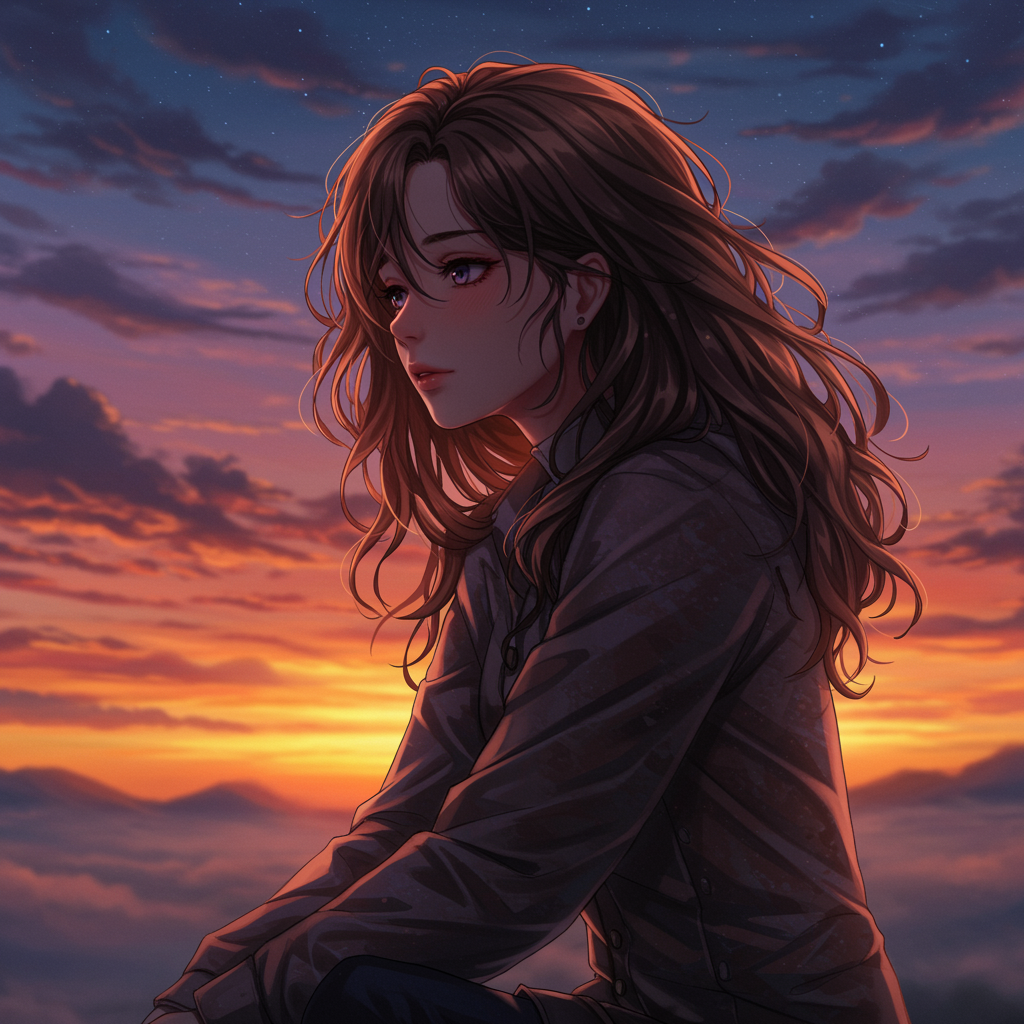 A scene capturing a stunning anime-inspired portrait of a young woman with wavy medium-length brown hair, sitting gracefully against the backdrop of a breathtaking sunset around 8:30 pm. The sky is a canvas of vibrant colors that highlight her beautiful, hyperrealistic features. She is dressed in intricately detailed clothing that catches the cinematic lighting, enhancing her striking presence. Her features are rendered in sharp focus, evoking a sense of serenity. The atmospheric volumetric fog adds a touch of mystery to the scene, which is worthy of trending on social media with its HDR and 4K resolution. The image is sharp, with a smooth, blurred background that complements her soft blush, while maintaining an overall elegance and beauty devoid of any deformities or poorly drawn elements. The composition is balanced with precise anatomy, capturing the essence of a captivating and immersive visual narrative.