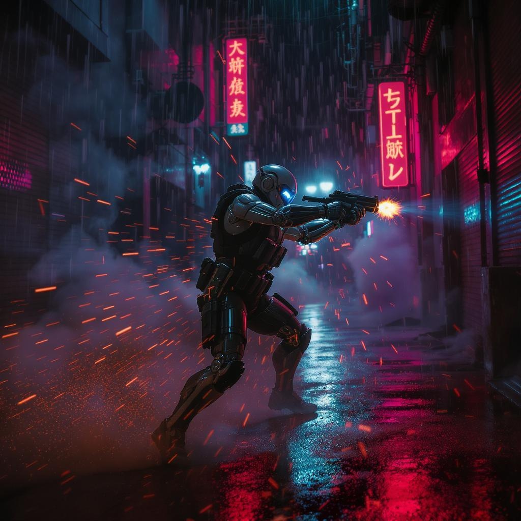 Cinematic ultra-wide shot of a futuristic cyborg law enforcement officer in an intense gunfight, featuring cybernetic limbs and a high-tech helmet with an integrated visor. Dodging and weaving in a dynamic pose, he's surrounded by a barrage of bullets in mid-air, creating a sense of motion and blur. It's a rainy night in a desolate alley illuminated by flickering neon lights, adding an atmospheric glow. Dense smoke swirls in the dim environment, accentuated by dramatic, cinematic lighting. The scene embodies trans-humanism and cyberpunk aesthetics with hyper-realism and hyper-detail. Set against a hyper-futuristic backdrop in a style reminiscent of the 1980s as captured by Paul Verhoeven.