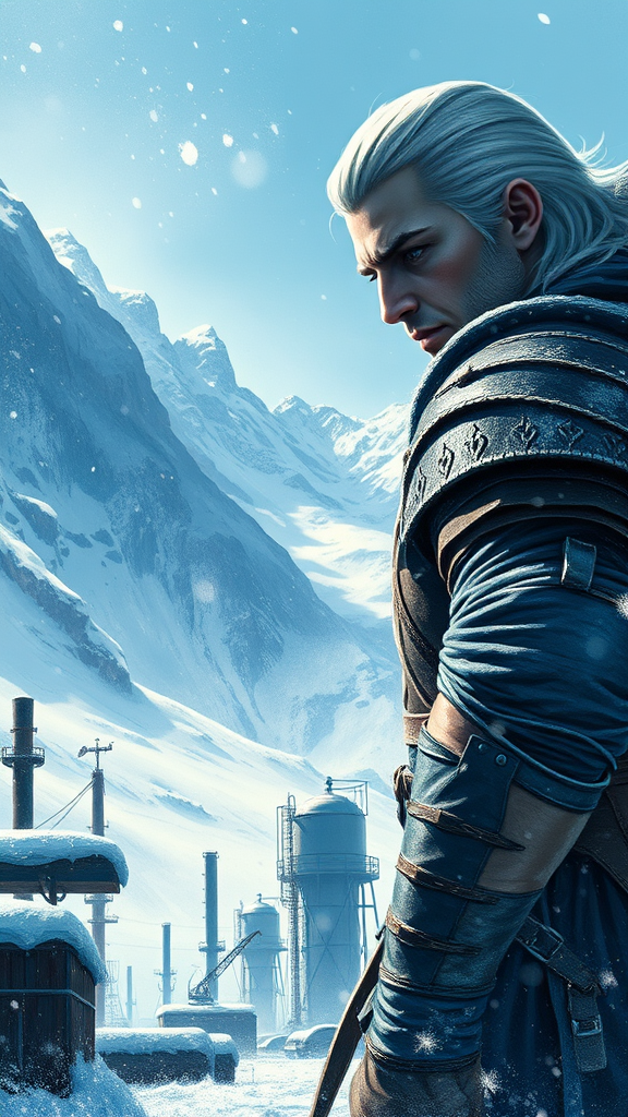 The Witcher artwork, inspired by brushwork exploration, blends light blue and indigo hues with expressive figure painting. It features the Witcher in a dynamic pose, set against a backdrop of towering, snow-capped mountainous vistas. The scene captures a wintry chill with snowflakes drifting gently through the air. In the foreground, industrial elements peek through the snowy landscape, adding a touch of human resilience to the wild setting. The close-up perspective highlights fine details, from the texture of worn leather armor to the fierce determination in the Witcher's eyes. The composition embodies a balance of elegance and raw energy, inviting viewers into a mystical, frozen realm.