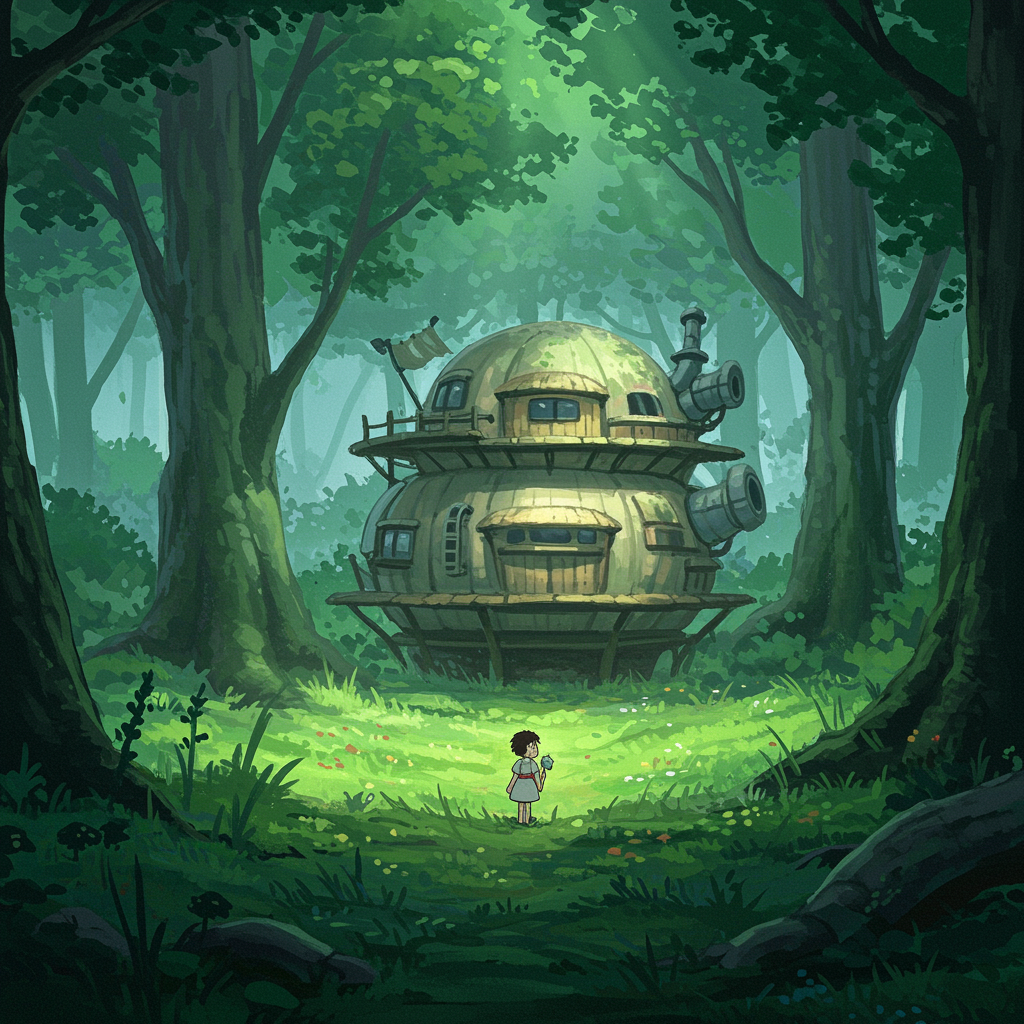 Digital 2D, inspired by Miyazaki's signature style, features an exceptionally detailed, fantastical landscape combining elements of futuristic sci-fi and magical dreamscapes. The scene depicts a small, endearing girl navigating her solitary existence amidst the vastness of a wild, enchanting forest. Nestled within this verdant expanse is a round, futuristic habitat, an architectural marvel of simplicity and complexity with its multi-layered design. This intricate cabin perched among the trees becomes her ethereal sanctuary. The artwork benefits from dramatic, gentle lighting, adhering to the rule of thirds, to create a cinematic atmosphere that resonates with wonder and tranquility.