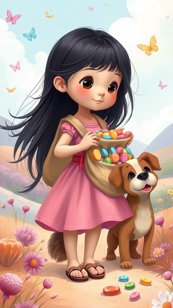 Young girl with flowing black hair, dressed in a charming pink dress and sandals, explores a whimsical world alongside her loyal pet dog with soft brown fur. She carries a sack bursting with colorful candies, each piece promising a delightful surprise. The scene unfolds in a pastel-hued landscape, filled with gentle hills and fluttering butterflies, evoking a sense of wonder and adventure. The 2D illustration captures the playful spirit of childhood with a touch of magic and whimsy.