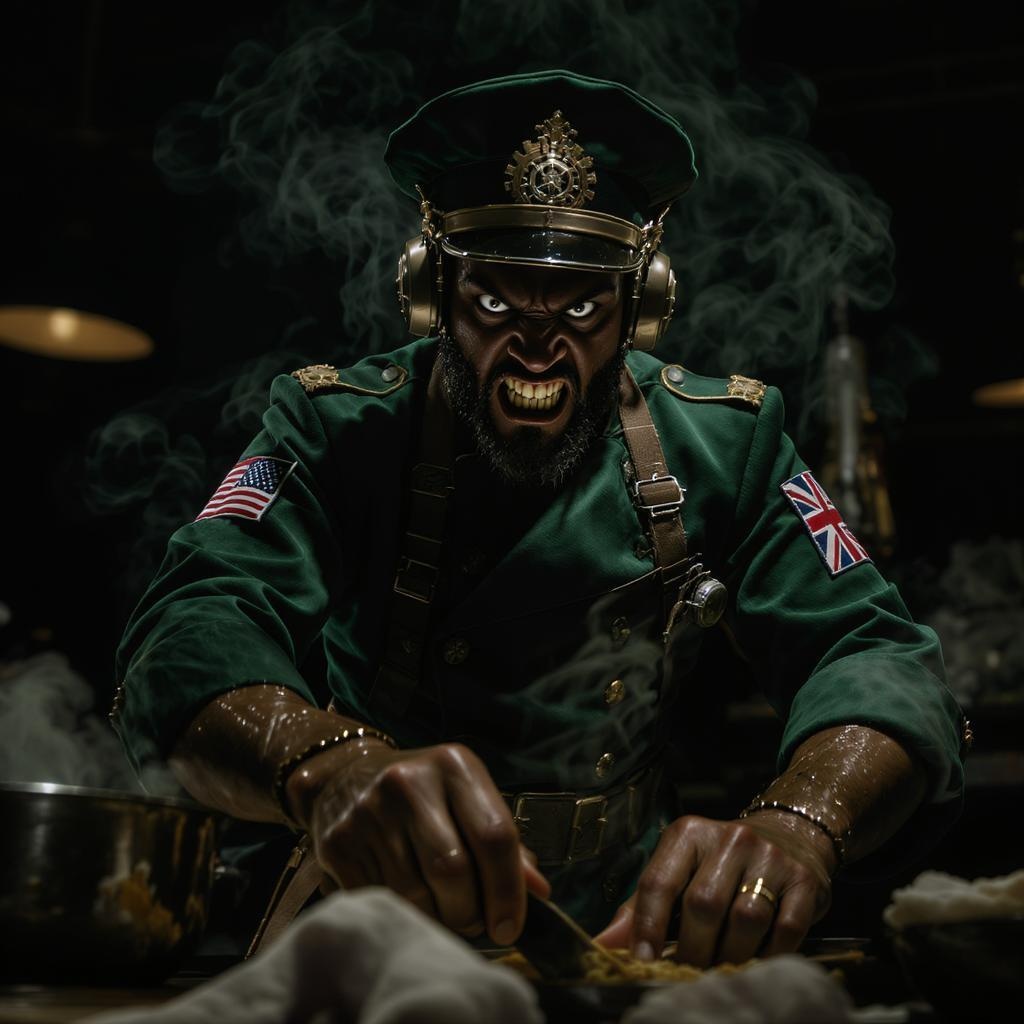Restaurant, intense and dynamic male cook in an intricate, highly detailed formal forest green uniform, steampunk influences, cinematic dramatic lighting, low angle perspective, captured in a vigorous action stance, meticulously rendered facial features, masterpiece quality, 8k resolution, dark, realistic fabric textures and folds, frenzy captured, wide-open eyes, raised eyebrow, furious expression, engaging with mundane culinary tasks, simplistic background, low contrast, subtle background elements, adorned with helmet and hard surfaces, an American flag and Union Jack subtly present, energetic and raw with slight deviations, daring and intense portrayal.