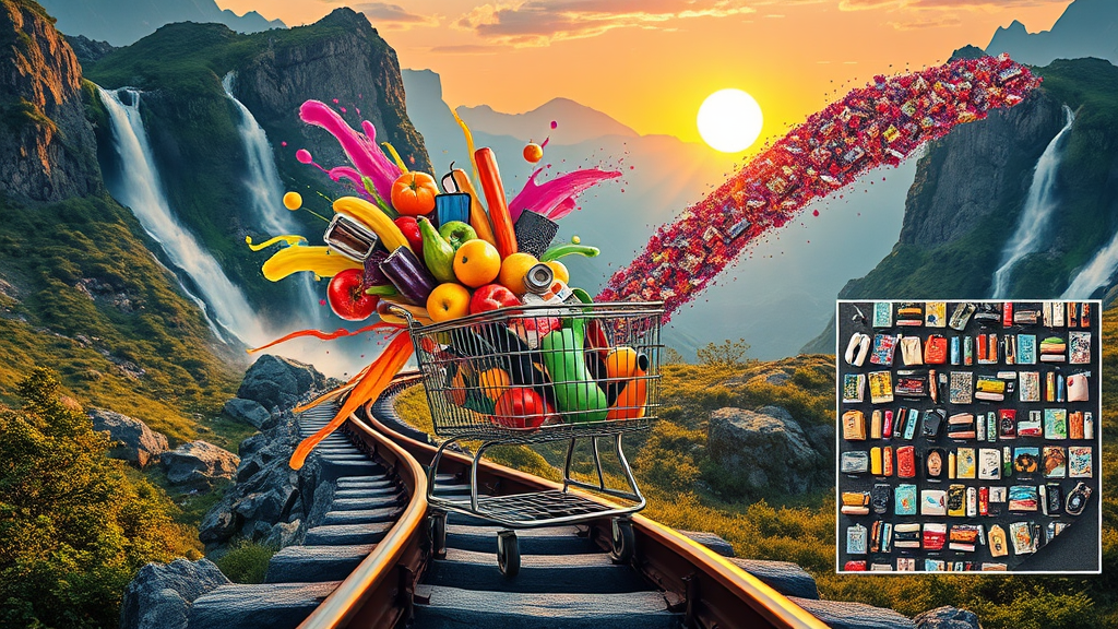 Create a vibrant and surreal image depicting a dramatic railway track slicing through a picturesque mountainous landscape with lush greenery and mesmerizing waterfalls. A central focus is a shopping cart precariously perched on the rails, bursting with an explosion of colorful objects symbolizing e-commerce excess. This brimming cart contains a kaleidoscope of items: fresh fruits, vegetables, electronic gadgets, household goods, and whimsical splashes of vivid, paint-like streaks emanating, forming a trail extending skyward. The scene captures a dynamic upward trajectory of objects, with a secondary image showcasing a dense, dizzying array of products floating and defying gravity. The setting sun casts a warm golden light, elongating shadows and enhancing the scene's visual drama. The hyper-realistic quality emphasizes meticulous attention to textures and materials, convincingly reflecting light and shadows. The overall atmosphere is overwhelmingly vibrant, full of kinetic energy, capturing imagination with fantastical commercial opulence. The piece blends themes and aesthetics cohesively, resulting in a surrealistic display of dynamic, colorful abundance, excluding static or dull elements. The image exudes high saturation, dynamic composition, and a surrealistic approach, capturing the intended essence.