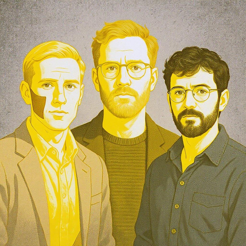 Three men depicted in an illustration style, each outlined in striking shades of yellow, set against a tall and narrow aspect ratio. The background is a muted palette that allows the vibrant yellow outlines to stand out, emphasizing their unique features and expressions, with a hint of modern artistic flair.