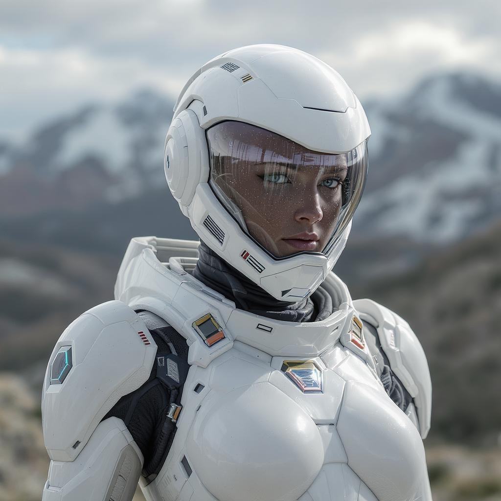 A high-tech white sci-fi female armor with a sleek cybernetic helmet, intricately detailed full-body spacesuit designed for insulation and protection, features a unique transparent visor revealing a bald head beneath, reminiscent of iconic sci-fi movie aesthetics. Captured in an outdoor setting with natural light illuminating the scene, the photograph showcases photorealism with cinematic rendering and advanced ray tracing. The image presents a third-person perspective with unparalleled quality and detail, highlighting the complexity and craftsmanship of the futuristic armor in an otherworldly landscape.