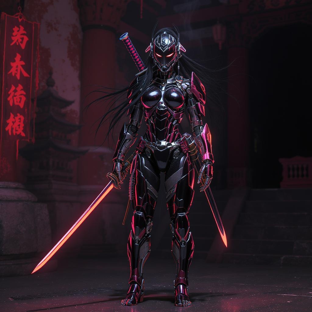 A full body view of a female cyberpunk robot samurai in the style of ck-sfc, featuring a robotic face with a mirrored face shield and a hyperdetailed helmet. She has flowing black hair and her reflective armor is a striking combination of black and neon red. Crafted from metals, cables, and wires, her body reveals intricate robotic joints. She stands barefoot, with a sleek katana strapped to her back. An abstract background subtly hints at an eastern temple, enhancing the futuristic and traditional fusion of the scene.