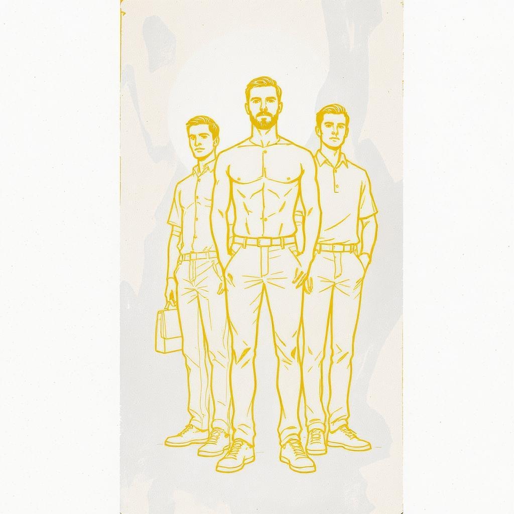 Illustration of three men with prominent yellow outlines, set against a tall, narrow composition with each figure distinct yet harmoniously integrated into the elongated frame. The scene captures a sense of unity and individuality among the figures, their expressions and postures conveying a narrative of camaraderie and strength. The use of yellow outlines adds vibrancy and emphasizes the contrast between the men and their textured background, enhancing the overall depth and intrigue of the artwork.