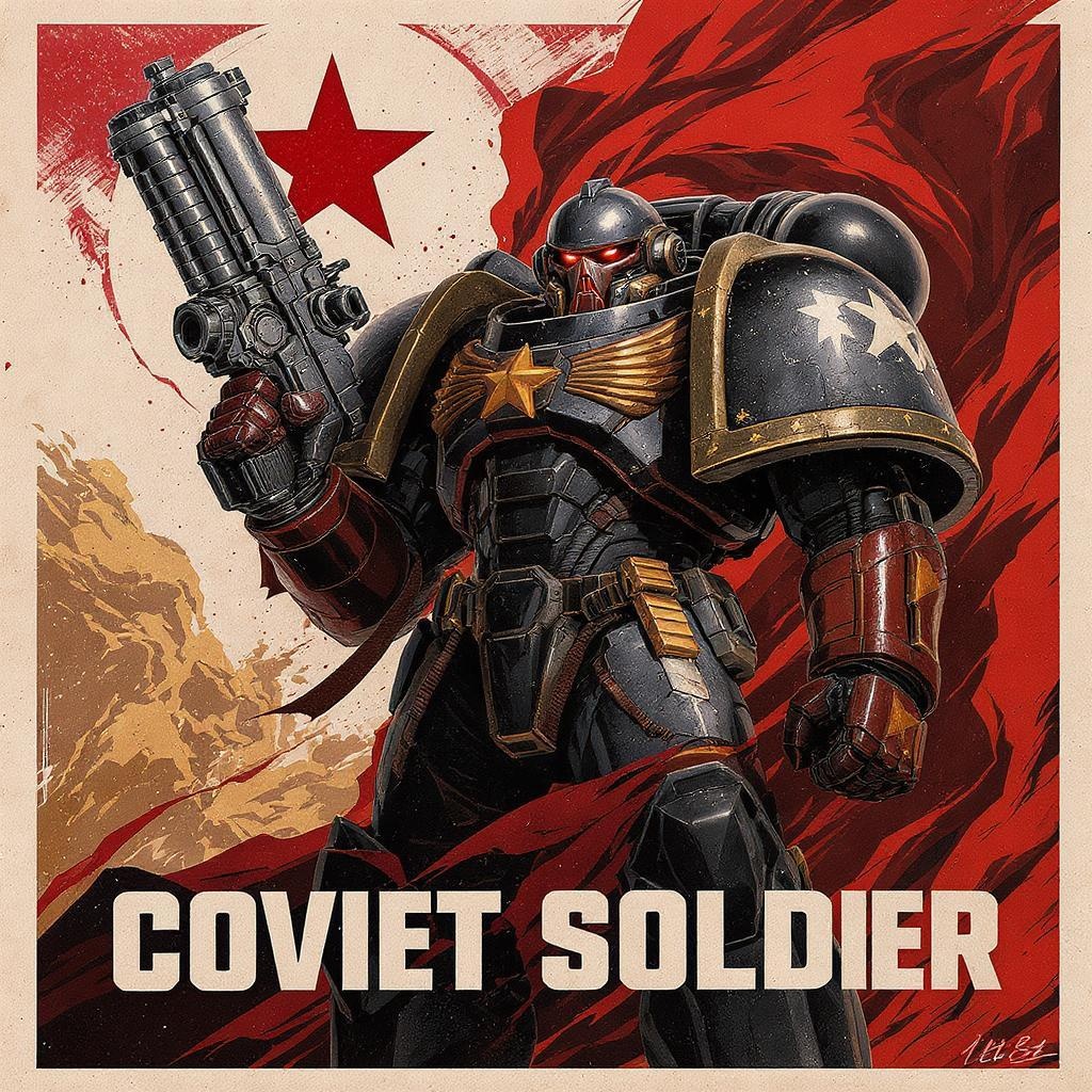 Warhammer-inspired futuristic Soviet soldier wielding a massive gun, clad in a sci-fi suit blending elements of anime and manga graphics. The figure stands prominently, adorned in a high-tech uniform with intricate details and dark color tones, reminiscent of classic USSR propaganda posters. The design features offset printing effects, enhancing the high detail and bringing a sense of realism and depth, as if illuminated by natural lighting in a vivid 8K resolution.