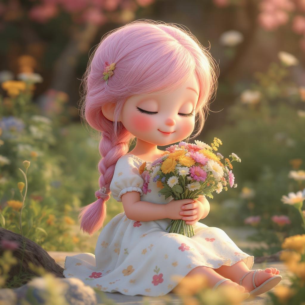 A sweet and gentle young girl with a bright side braid of pastel pink hair, cherubic round face, soft and gentle smile lines, and a compassionate expression, dressed in a flowing gown with a delicate floral motif and simple sandals, lovingly clutching a vibrant bouquet of wildflowers, exuding warmth and empathy, IP character, rendered in stunning 3D C4D, 8K with OC renderer, enclosed in a blind box, showcasing top-tier quality with cinematic lighting and rich contrast, highly detailed, reminiscent of award-winning art in UHD, masterfully created with 3D rendering, maintaining an expressive and scenic style.