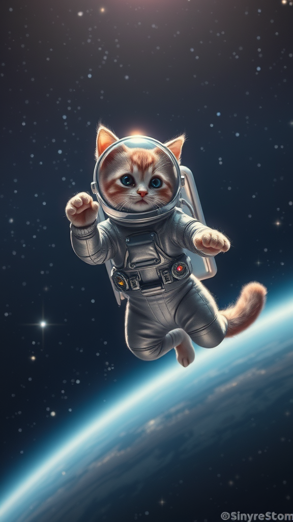 A sleek feline astronaut gracefully floats in the vastness of space, its glossy spacesuit shimmering under distant starlight. The suit, intricately detailed with tiny panels and glowing buttons, fits snugly around the cat's agile form, allowing its bushy tail to playfully curl behind. Its helmet, crystal-clear and impeccably polished, reflects the cosmos while revealing the cat's curious, bright eyes absorbing the wonders of the universe. Tiny space paws gently paw at the void, as if attempting to catch the sparkling dust drifting by. The cosmic backdrop, an endless tapestry of stars and swirling galaxies, adds to the grandeur of this otherworldly journey, giving the scene a sense of boundless adventure.