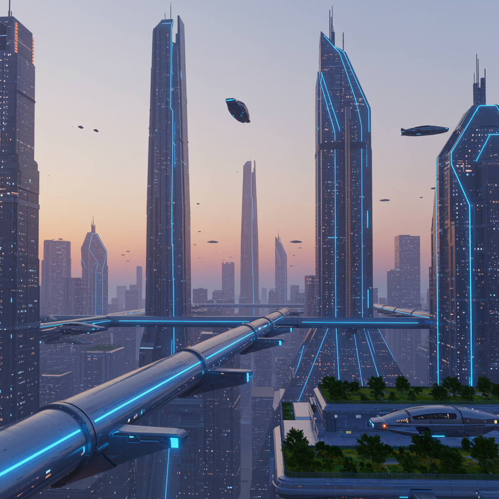 A sleek futuristic cityscape at dusk, where towering skyscrapers with clean, minimalist lines contrast against a soft gradient sky. The city is interconnected by levitating transit tubes and dotted with lush green terraces. The scene is lit by neon hues of blue and orange, casting a modern glow on shiny, streamlined vehicles gliding silently through the air. The architecture is characterized by geometric simplicity, using primarily chrome and glass materials, while the limited color palette enhances the city's ultra-modern and efficient atmosphere.