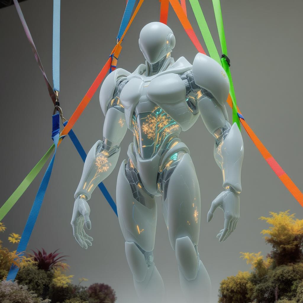 A futuristic photoshoot featuring an advanced, alien-like full armor, elegantly suspended and showcased with vibrant, crisscrossing thick mooring straps that dominate the frame. The armor, crafted from a translucent, frosted material with a matte finish, offers a smooth surface with a soft, cloudy translucency that gently reveals and blurs the interior. Inside, glowing foliage and minimal electronic elements emit soft hues of amber and teal, creating a harmonious blend of biotechnological and organic features. The armor design is abstract and avant-garde, departing from traditional humanoid shapes. It boasts elongated, flowing curves, complex geometric configurations, and unexpected articulations, evoking an alien-like, organic form. The sleek, minimalist exterior reveals no recognizable humanoid outline, suggesting a futuristic, imaginative design that’s both fluid and unconventional. Through the semi-translucent material, faint glimpses of the blurred interior elements enhance the armor's ethereal, otherworldly presence. Hovering in mid-air, the armor is secured by bright mooring straps in electric blue, neon orange, and vivid green, providing a stark contrast to the soft matte finish of the armor. These straps, akin to those used in high-end art installations, create a striking juxtaposition between the futuristic design of the armor and the practical, utilitarian nature of the mooring system. The backdrop presents a minimalist aesthetic, featuring subtle neutral gradients that maintain focus on the armor. Organic additions like moss, exotic foliage, and alien-like flora in vibrant yellows, purples, and greens subtly enhance the futuristic design. This contrast adds a touch of life and nature to the clean, technological aesthetic. The camera angle is unconventional, extremely close to the armor, showcasing intricate details, the texture of the frosted material, and the vibrant mooring straps crisscrossing in the background. The lighting is soft yet precise, creating delicate reflections and highlights on the armor’s surface while emphasizing the contrast between the luminous plants, the minimalist structure, and the bold neon straps. Captured in an ultra-realistic, hyper-detailed 35mm photography style, this image evokes the essence of a high-tech fashion magazine shoot, with every detail sharply defined and vivid, drawing the viewer into this futuristic and ethereal presentation.