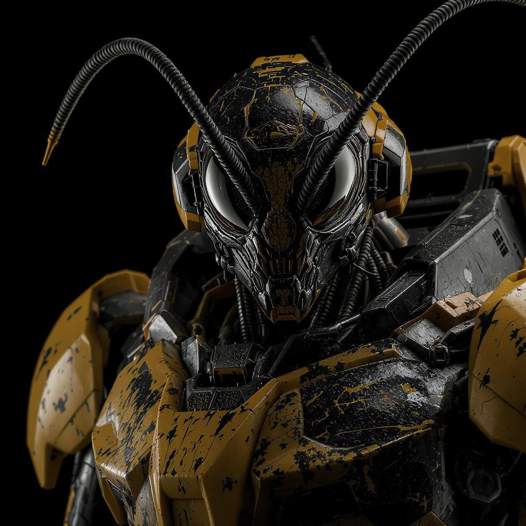 A menacing black and yellow battle mech featuring intricate detailing and a sci-fi mask with stunning reflection properties. Its insectoid design includes a powerful jetpack, while the bright yellow polymer armor is decorated with distinctive marks and natural textures. Set against a dramatic black background, the mech exudes an eerie and intimidating presence. Captured in ultra high resolution, the photorealistic representation utilizes top-down Rembrandt lighting, emphasizing the mech's hyper-realistic features and cinematic quality. The scene is devoid of distractions, maintaining focus on the mech's fine details and combat readiness.