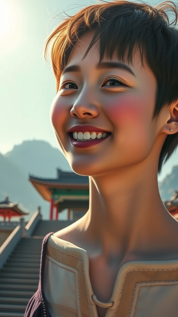 ganyudef upper body smile blush outdoors sunny day simple background clear sky short hair temple gaze stairs mountainous moody lighting 8k UHD HDR dual visage hybrid whimsical long neck unique fingers artistic focus low resolution out of frame abstract surreal jpeg artifacts natural soft tones harmonious balance enriched color depth