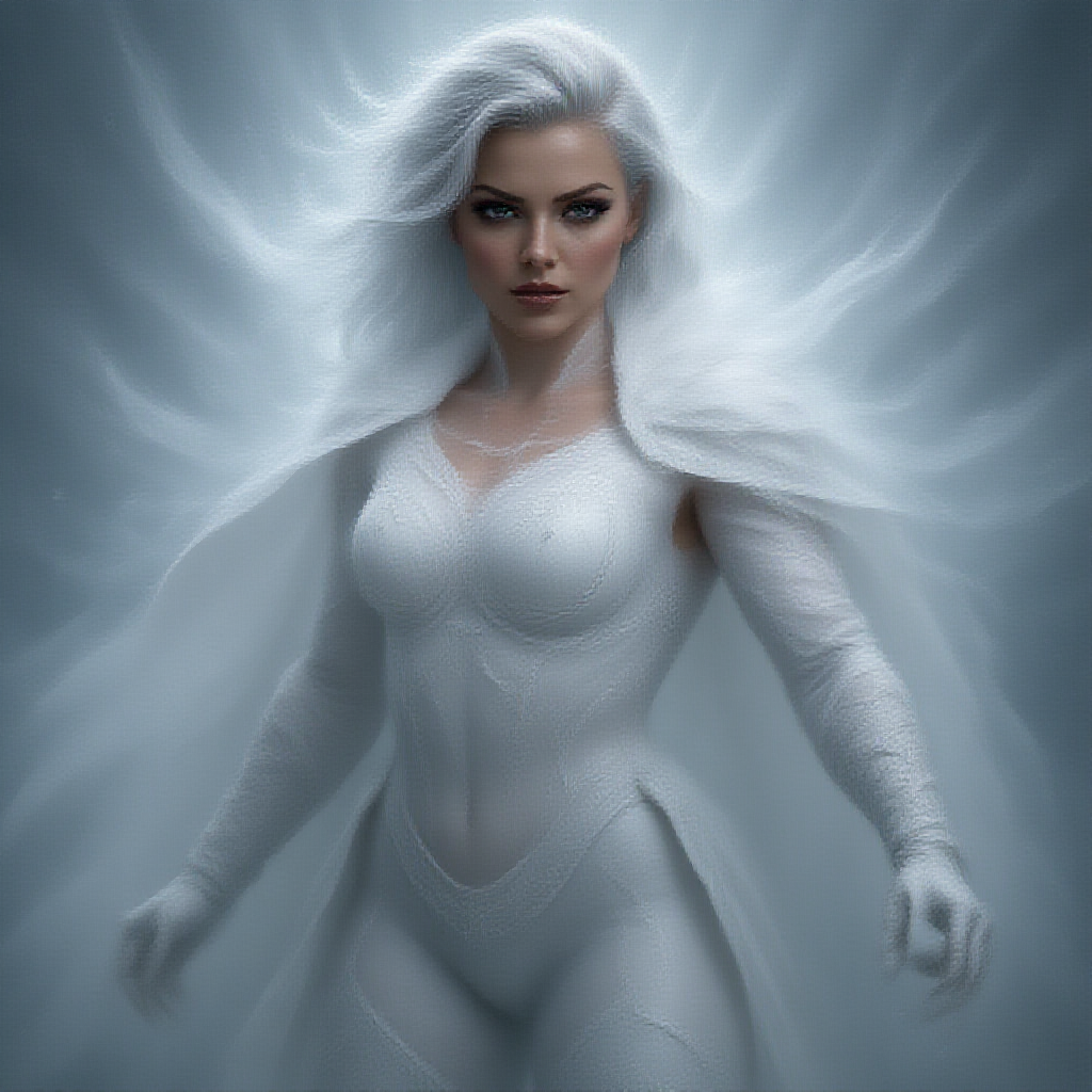 Create an ultra-detailed masterpiece in extreme vivid fantasy realism style featuring Storm from Marvel, rendered in hyper-realistic fantasy digital photography. Capture the scene with meticulous precision, focusing on perfect composition and an overexposed atmosphere that enhances an ethereal ambiance. Emphasize sharp details, with clear, bright elements highlighting Storm's iconic white attire. Illustrate her expressive eyes, filled with both power and compassion, as she strikes a dynamic pose with her flowing cape. Seamlessly merge realism with fantasy to celebrate her essence of command and weather control, set in a visually stunning and imaginative environment infused with subtle artistic modifications that maintain the core essence.