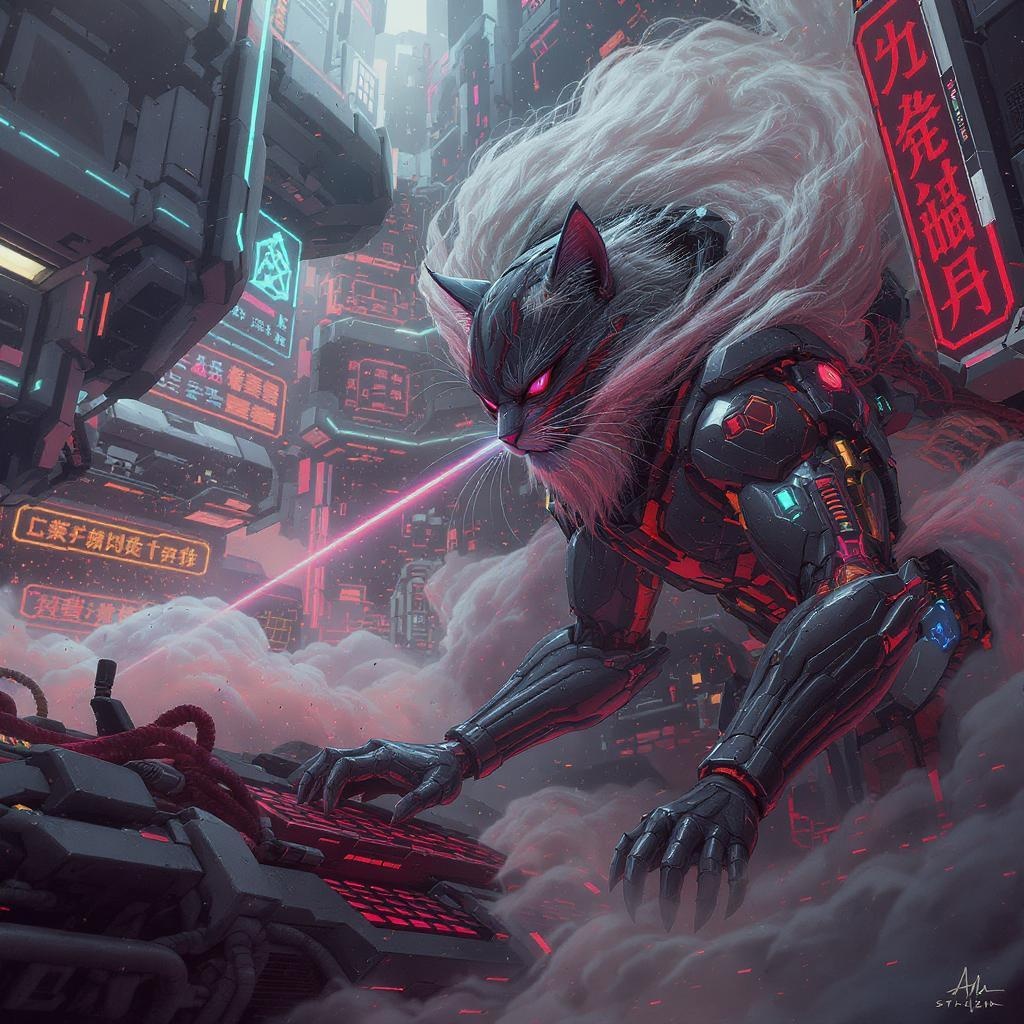 A stunning illustration of a feline hacker navigating a futuristic cybernetic landscape, its sharp face illuminated by volumetric fog and piercing godrays, set against a backdrop of vibrant colors and high saturation. The scene is reminiscent of works by Greg Rutkowski, Jesper Ejsing, Raymond Swanland, and Alena Aenami, with a unique wide-angle, vertical orientation. The artwork features the feline with multiple heads and bodies, seamlessly integrated into the bustling, high-contrast environment, while maintaining an air of mystery and intrigue in its expression and posture. This captivating piece would be a standout feature on ArtStation, inviting viewers into its enigmatic, layered world.