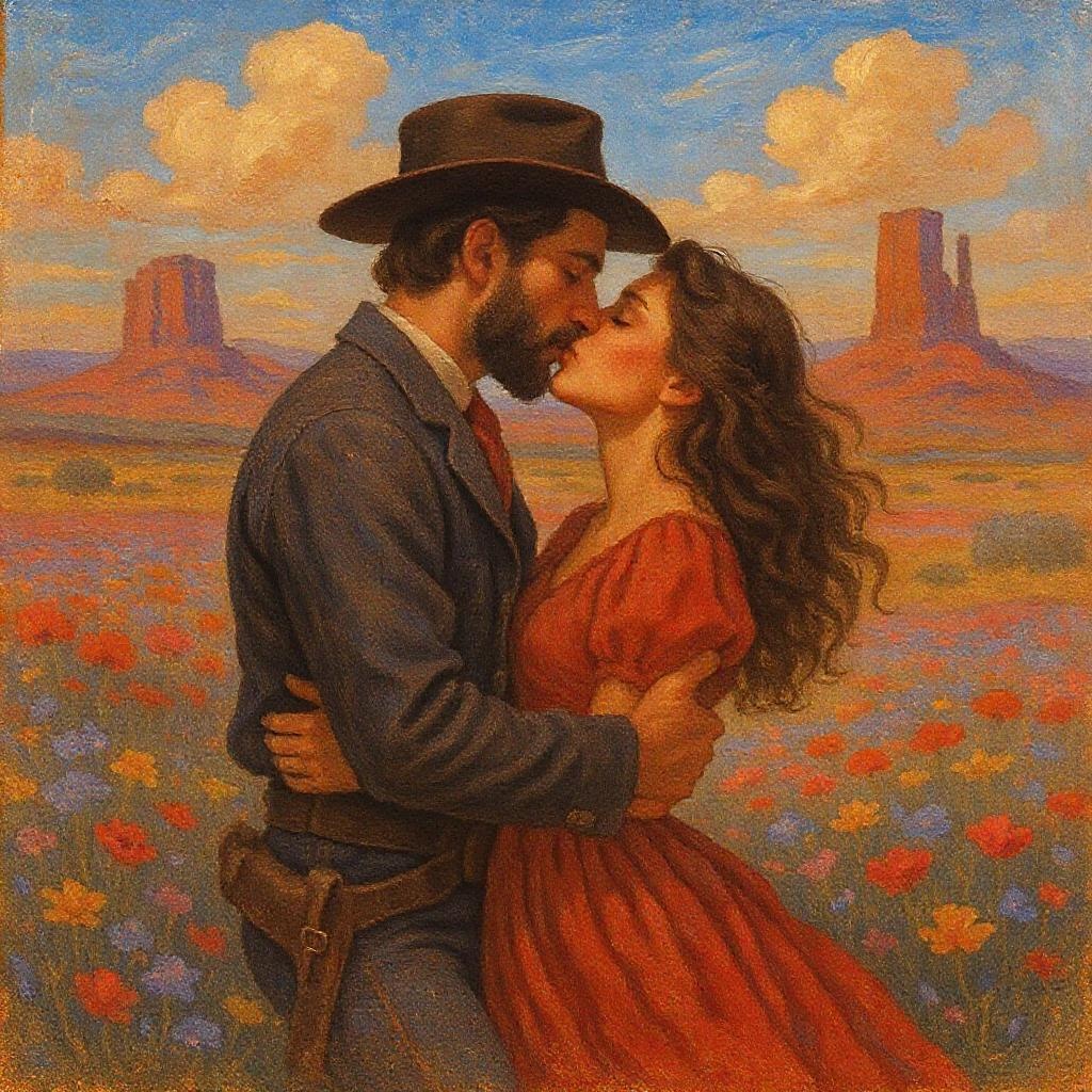 A vivid romance illustration capturing a couple locked in a passionate kiss, evoking the spirit of a romance novel, set against a vibrant wild west landscape with a blooming carpet of flowers swaying gently in the breeze, captured in a raw and unfiltered style, emphasizing their timeless love.