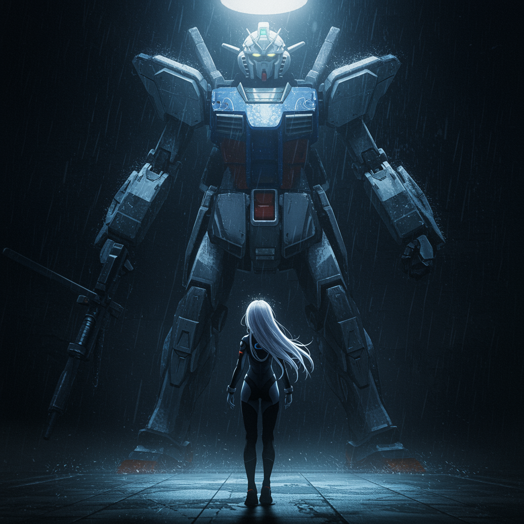 On a dark, rainy night, a girl in a sleek, form-fitting jumpsuit stands alone before a towering mecha, her long, white hair billowing in the wind. The giant robot looms overhead, its gleaming surfaces reflecting the sparse light, evoking a sense of celestial grandeur. Despite the rain, every detail in this cinematic scene is meticulously rendered, as if captured by a masterful lens. The setting feels surreal and divine, reminiscent of a high-concept manga brought to life in stunning 3D CGI. However, subtle artistic imperfections add an extra layer of intrigue to the composition, hinting at a world where beauty and flaw coexist—a masterpiece of contrasting elements.