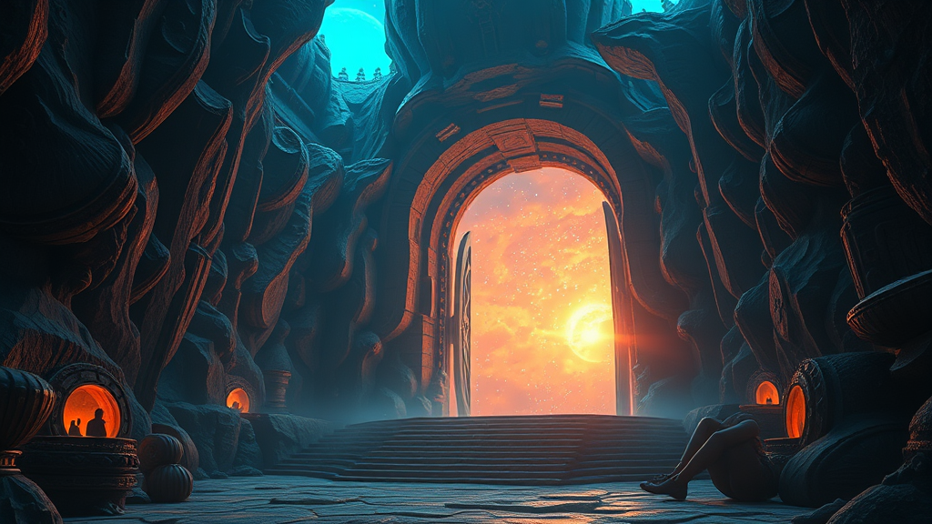 Cinematic depiction of celestial entryways, intricately detailed, 8k resolution, hyper-realistic, ethereal ambiance, in the style reminiscent of Ivan Aivazovsky, Peter Mohrbacher, and Greg Rutkowski, enriched with volumetric lighting, expansive illumination, oil painting texture, blending fantasy and sci-fi elements, hyper-realism, premium quality, rendered with the Unreal Engine feel.