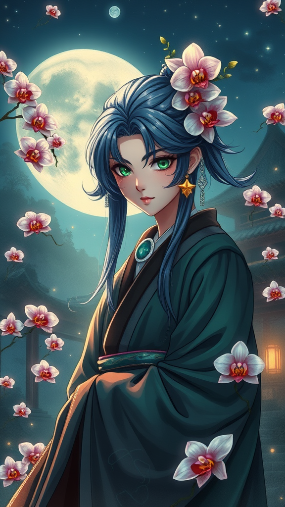 A mysterious anime sorcerer from the Tang dynasty with an orchid hair accessory and a jade charm stands at midnight in an ancient temple, gazing directly with emerald green eyes and midnight blue hair adorned with a celestial star ornament. The scene is set in a mystical landscape, reminiscent of Kay Nielsen’s art style, with flowing robes that ripple like silk in the moonlight. Orchid blossoms swirl around like magical sparks, while lighting shines like a thousand constellations. The composition is a wide-angle portrait, featuring mystical lighting and a mixed media rendering with expressive elements, capturing the enchanting essence of this otherworldly being.