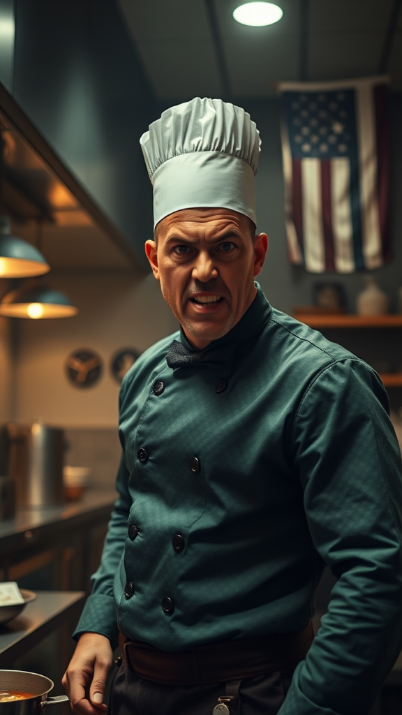In a bustling restaurant kitchen, an aggressive male cook stands in his intricate, highly detailed formal forest green cloth uniform. The setting features a steampunk aesthetic with dramatic, cinematic lighting. Captured from a low angle shot, his dynamic action posture highlights his command over the culinary chaos around him. The scene showcases the cook's expression with highest facial details, his face a masterpiece in 8k resolution. He appears consumed by a frenzy, with wide-open eyes and a raised eyebrow conveying his intense anger at the uninspired ingredients before him. The realistic fabric details and folds of his uniform add texture, while sparse background elements in monochrome create a low-contrast, simple backdrop, hinting at a mundane culinary environment. Hard surfaces and minimalistic decorations, such as a faded flag featuring stars and stripes, contribute to the scene's subdued atmosphere.