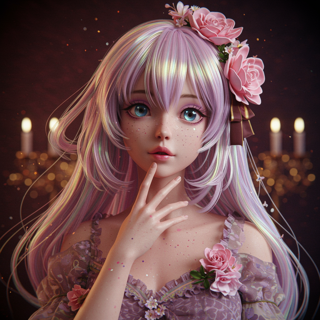 Gorgeous anime girl portrayed through thick acrylic illustration and oil painting, accentuated by extreme iridescent reflections and delicate flower decorations. The piece features chiaroscuro and holy cinematic rim lighting, inspired by rococo art CGI for a doll-like 3D effect. Rendered in Octane with an emphasis on dramatic lighting and texture, the composition carries a low-resolution charm with intentional text errors and cropped sections. This character study embraces artistic imperfections such as noise, digital artifacts, and experimental anatomy, giving rise to a unique beauty through blended limbs and abstract features, resulting in a surreal, imaginative portrait.