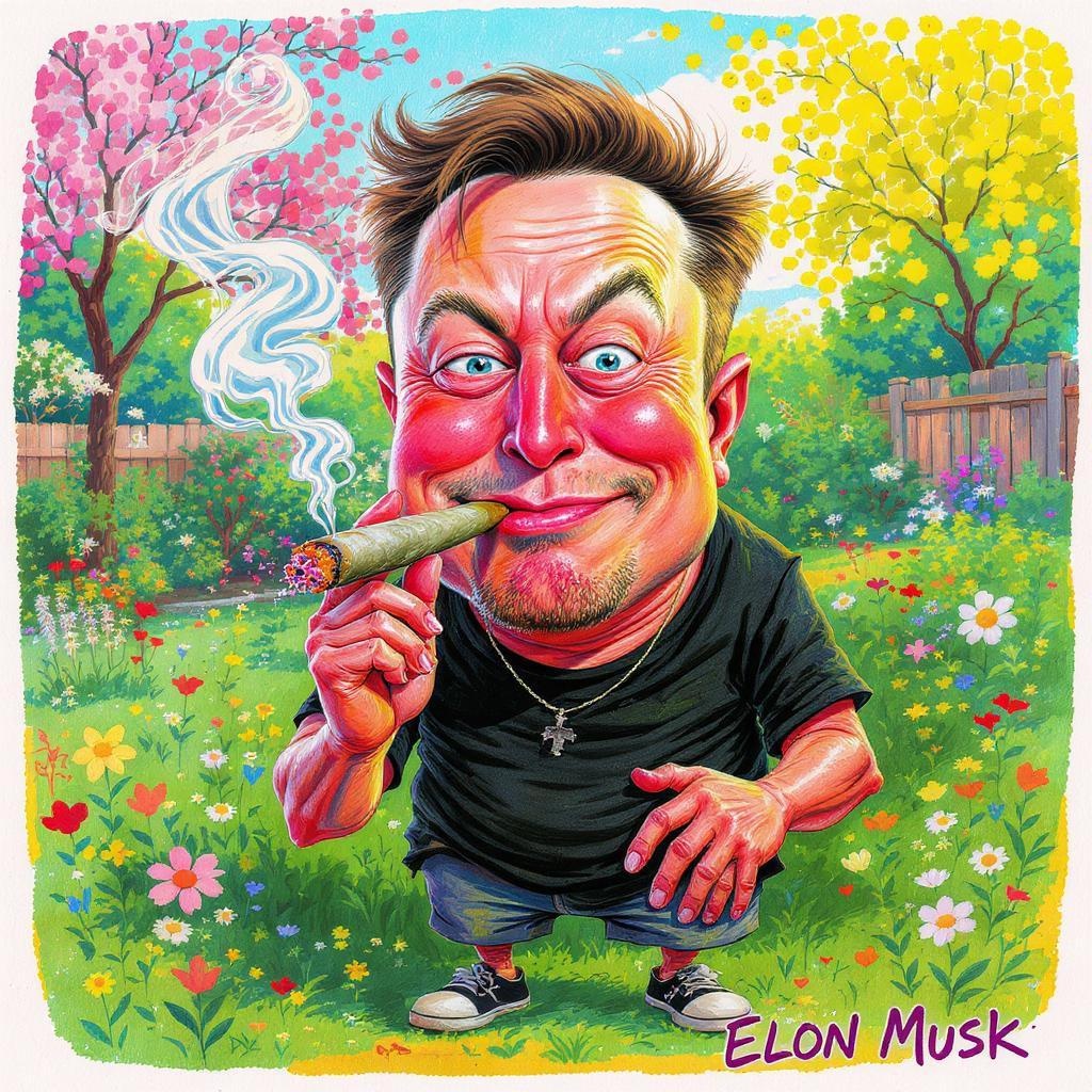 A humorous and imaginative illustration of Elon Musk in his garden during springtime, smoking a blunt with a cheeky expression. The artwork features a caricature style with vibrant, bright colors and saturated tones, portraying Musk making eye contact with the viewer. The piece is digitally crafted with a creative blend of paint splashes, ink, and fine art pencil strokes. This quirky depiction includes whimsical imperfections like poorly drawn hands and feet, an exaggerated face, and a slightly disfigured anatomy, adding to its comedic charm. Elements like extra limbs and parts of the body slightly out of frame contribute to the playful composition, while maintaining a central focus on Musk's character. The background bursts with colorful spring elements, enhancing the lively and dynamic feel of the scene.